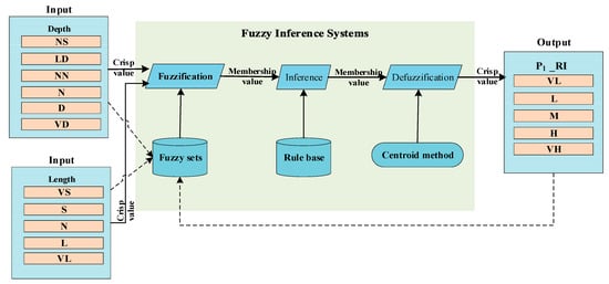 Every input/output parameter was rated according to the provided data and a different number and a different scale of membership functions were defined for each parameter in the proposed blended hierarchical fuzzy logic model. Figure 10 indicates the input/output triangular membership functions for P1_FIS. The linguistic terms NS, LD, NN, N, D and VD were assigned to the membership functions of input variable depth and the membership functions of input variable length were labeled as VS, S, M, H and VH. Similarly, the membership functions of output variable P1_RI were labeled as VL, L, M, H and VH.