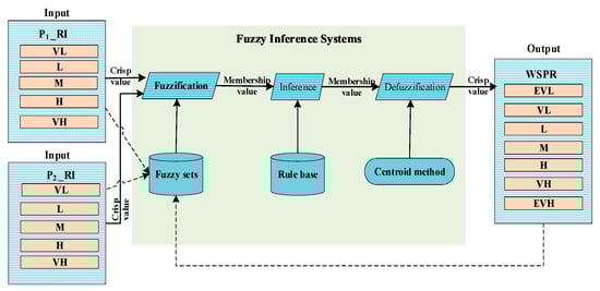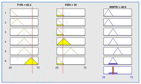 Figure 14 shows the triangular membership functions for the blended FIS. The same number of membership functions with the same labels were considered for input variables P1_RI and P2_RI as defined in P1_FIS and P2_FIS. The linguistic terms assigned to the membership functions for output variable WSP_RI were EVL, VL, L, M, H, VH and EVH. The rule viewer for some sample rules is shown in Figure 15.
