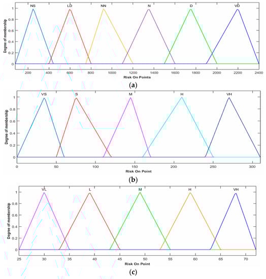 Input/output triangular membership functions for P2_FIS. (a) Input leakage; (b) input age; and (c) output partial 2 risk index.