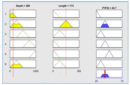 P1_FIS has two inputs, namely depth(X1) and length(X2). The structure diagram of P1_FIS is shown in Figure 7. For each input variable, a different number of membership functions are defined depending on the data variation. According to the number of input and output fuzzy sets, a different number of rules are defined for each fuzzy logic in the proposed model. We defined six fuzzy sets for depth and five for length. Hence, according to Equation (2), the number of rules for P1_FIS can be defined by putting n = 6 and m = 5, so R = 6 × 5 = 30. The rules designing P1_FIS logic were carried out as shown in Table 1.