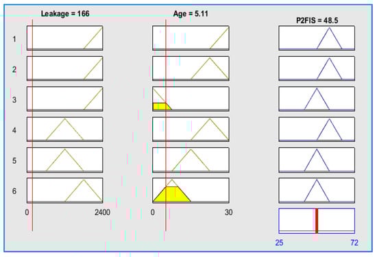Similarly, P2_FIS has also two fuzzy logics, namely leakage (X3) and age (X4), as well as one output variable, P2_RI. The structure diagram for P2_FIS is shown in Figure 8. For input variables leakage and age, six and five fuzzy sets were defined, respectively. Hence, like P2_FIS, the same 30 fuzzy sets are also defined for P2_FIS. The rules designing P2_FIS were carried out as shown in Table 2.