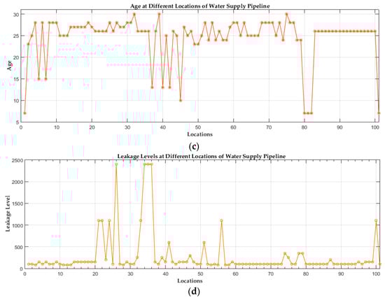 Graphical representations of input data: (a) depth; (b) length; (c) age; and (d) leakage.