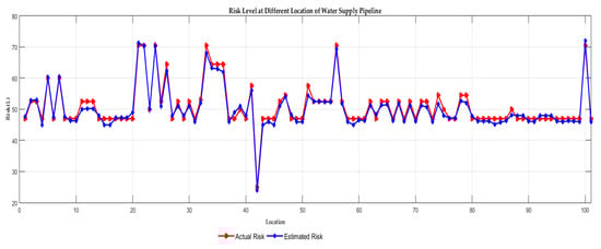 Figure 17 shows the actual risk index and the blended risk index values at different locations of water supply pipelines. The accuracy of the results using the fuzzy inference system rely on the accuracy of rules; more accurate rules mean more accurate results. As the proposed blended hierarchical fuzzy model makes the construction of rules in the rule base very simple, the rule manager can easily construct the rules with better preciseness in the rule base, which ultimately contributes to the accuracy of the system. The performance evaluation of the blended hierarchical fuzzy logic model was carried out using RMSE to measure how the computed risk index values compared to the actual risk index values. The value of RMSE was 1.3154, which indicates that the performance of the blended hierarchical fuzzy logic model is appropriate and suitable to be used in any practical application.