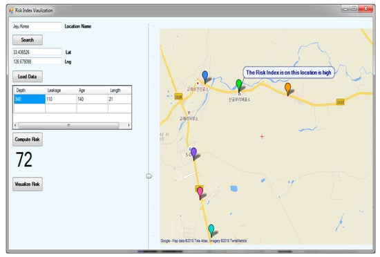 Figure 18 shows the visualization of the water supply risk index values. First, the risk index values were computed using blended hierarchical fuzzy logic model and then the computed risk index values for water supply pipelines were plotted on a GIS map in order to help the caretaker to trace the defective points in the water supply pipeline. The latitude and longitude of the location, where water supply pipelines risk index values are needed for calculations, are provided (the latitude values are not real). Next, the location where pipelines are installed was searched and the values of the parameters depth, leakage, age, and length were loaded by clicking on the load button. Then, the risk index of the water supply pipeline of the given location was computed by clicking on the compute risk button. Finally, the risk index values were shown on GIS map in the form of a marker. We used different marker colors to represent different risk index levels. Specifically, red, blue, green, orange, purple, pink, and light blue markers represent the extremely very high risk, very high risk, high risk, medium risk, low risk, very low risk, and extremely very low risk, respectively.