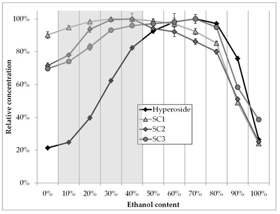Probably SC1 to SC3 are flavonoids as well, because their adsorption maxima in UV/VIS-spectra show significant bands at 207–215 nm, 257–270 nm and 332–359 nm [24]. Established products are commonly extracted with 45 vol. % ethanol, rest water [9,10,11,12,13]. Assuming SC1 to SC3 are also flavonoids, this solvent is a preferable mixture to achieve high total flavonoid content in the extract.