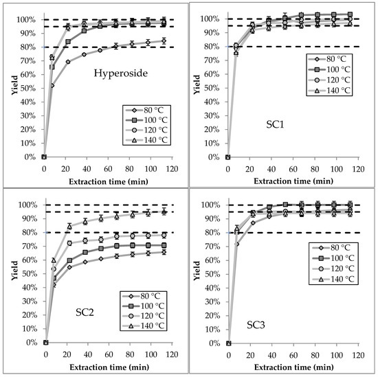 - Hyperoside: The screening shows that hyperoside is almost entirely extracted after 60 min at 100 °C. A Yield of 95% is reached after about 20 min at 120 °C and 140 °C. At that temperature, the productivity is 250% higher compared to 100 °C and 700% higher compared to 80 °C. A decline in yield with rising temperature cannot be observed, indicating a high thermal stability of hyperoside.