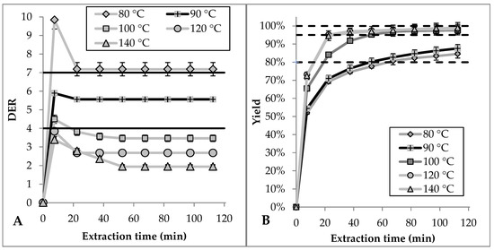 Already commercialized hawthorn drugs are extracted to a specific DER ranging from 4:1 to 7:1. To ensure a good comparability towards established products, that parameter is investigated as well. Figure 7 shows the extraction curves for hyperoside and the DER in the investigated temperature range.