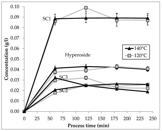 To be aware of thermal degradation in hot water extraction is the key parameter for successful extraction [5,6]. As shown in the screening, no clear thermal decay could be traced by the provided data. For that, recycling-mode experiments were performed at 120 °C and 140 °C to assess the impact of high temperature toward hyperoside. The results are given in Figure 8. As it can be seen, all regarded components are quite stable at high temperatures. Only SC3 shows a rather small decline in concentration after 4 h of process time. At the chosen extraction temperature of 90 °C no thermal decay occurs, and the degradation kinetics can be neglected in the physico-chemical extraction model.