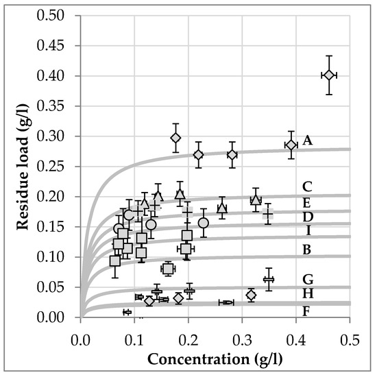 The adsorption/desorption equilibrium inside the pores is described through equilibrium curves. Herein q is the plant material’s residual load linking the equilibrium curve with the pore diffusion model. A well-known approach is e.g., the Langmuir-equilibrium. The parameters KL and qmax can be derived from measurements. The maximum load qmax is the total amount of the regarded target and side components. The equilibrium curves are measured with multistep macerations. The approach is described in detail in the literature [14,15].