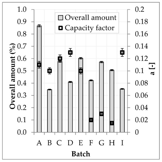 The overall amount with respect to the reference batch I varies from −1% to +146%. The capacity factor assumes values between 0.10 and 0.13 for all batches except F to G. Batches F to G showed significantly fewer flowers in the extraction material; the capacity factor for these samples was 0.021 ± 0.006. The results are shown graphically in Figure 12.