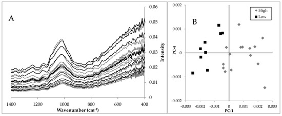 (A) Spectra of the different harvest batches, black: batches F, G, H (low share of flowers), grey: rest (high share of flowers); (B) PCA of the second derivative of the hawthorn harvest batches spectra.