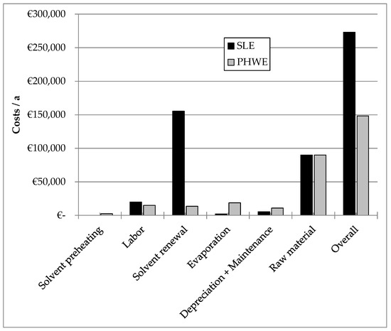 The result of the cost study is shown in Figure 15. The total annual PHWE costs are about 50% less than conventional extraction. The biggest difference is the annual solvent change. Hot water extraction can save about 99% of the costs compared to SLE. If the solvent is not renewed annually, the PHWE is still about 30% cheaper. However, the evaporation of the aqueous extract takes up about 10 times the amount of energy. The significantly shorter process time for hot water extraction means that staff can be used much more efficiently, which means that the personnel costs of this product are around 20% lower than in the comparative process.