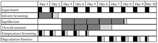 The evaluation of hot water extraction and conventional percolation is based on a valid model parameter determination which can be handled under sensible experimental effort. For the modelling and simulation of extraction processes to become routine industrial processes, the path shown must be superior to a purely empirical design using statistical experimental design. For this purpose, Figure 16 shows a schedule for a complete parameter determination which must be handled by a person with the corresponding equipment. Black is the actual working time, dark gray are the times in which the experiment does not have to be supervised and light gray is the time in which the analysis takes place.
