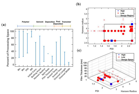 The two-dimensional plots can be generated for each pairwise combination of design variables, or on the selected promising design variables identified in the one-dimensional analysis. Figure 4b delineates the promising design region using the polymer polydispersity index (PDI) and Hansen radius. The area of the identified design region relative to the full area spanned by the design variables is quantified by rs = 0.27, for S = {3,7}. Thus, future experimental efforts can be focused on only 27% of the original design region. When film thickness is additionally added as a classifier, rs = 0.056, for S = {3,7,9}.