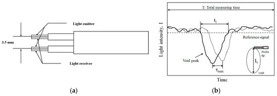 Reflective type optical fiber probe and illustration of determination method of local void properties: (a) Reflection type optical fiber probe; (b) Typical output signal.