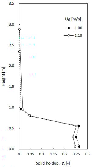 The axial distributions of solid holdup in the first regenerator at different gas velocity are shown in Figure 3. The initial static height in the first regenerator was 0.6 m. The dense bed was formed at a height of 0.7 m from the distributor at given gas velocities. A transition region from dense to dilute phase was shown due to the increase in entrainment of the catalyst particles from the dense bed. An increment of gas velocity decreased the solid holdup in the dense bed. Particularly, gas eddies, solid down-flow, and temporarily stagnant solid-gas flow were observed at the column wall around dense region. The flow behavior near wall may be caused by shear force from turbulent gas eddies and solids down-flow as in bubbling fluidization in larger beds more than 0.3 m, where solids emulsion has gulf streaming [18]. Therefore, the first regenerator forms a gulf-stream structure of gas-solid flow, where with up-flow in the center region and emulsion down-flow near the wall region at the operating gas velocities of this study.