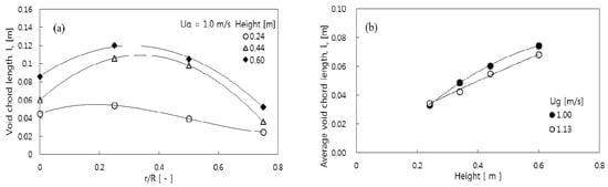 (a) Radial profile of local void chord length at Ug = 1.00 m/s and (b) Effect of height in the bed on area-mean void chord length.