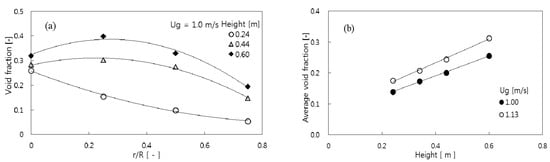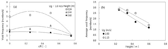 The variations of local void frequency (f) along the radial position and the area-mean void frequency with height are shown in Figure 6a,b. The local frequency had relatively higher values in the core region and decreased toward the wall region due to the bubble flow pattern in the bed (Figure 5). The area-mean void frequency decreased along the column height due to the void coalescence as in the bubbling fluidized bed [18].