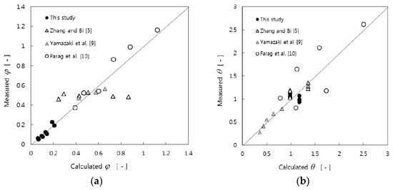 The ϕ and θ values calculated by Equations (10) and (12) are compared with values obtained from results in present and previous studies [5,9,10] as in Figure 9.