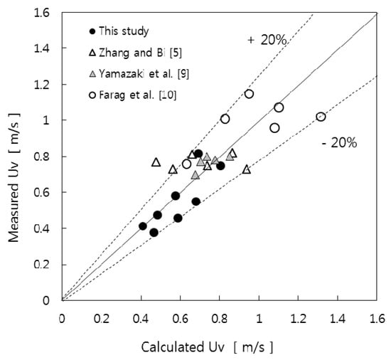 The comparison between the measured and calculated void rising velocities from Equation (6) using Equations (8) and (10)–(12) is shown in Figure 10. It shows a good agreement with average error of 13.5%.