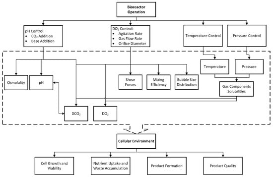 The goal in the operation of a bioreactor is to enhance the growth, viability, and productivity of organisms by adjusting their environment. Figure 1 presents a cause and effect diagram of bioreactor operation. The main operational parameters are impeller rotation speed, gas sparging flow rate, pH, and temperature. Inefficient mixing creates spatial gradients in mechanical shear, volume fraction of gas phase, dissolved oxygen (DO), carbon dioxide and metabolites concentrations, pH, and temperature. As organisms move inside the reactor they experience fluctuations in environmental conditions that affect metabolism, yield, and quality of product [9]. Due to low solubility in water, high densities of organisms quickly consume all the oxygen in a saturated culture and produce enough carbon dioxide to have inhibitory effects. Therefore, the addition and removal of gases are inevitable parts of fermenter operation. Bioreactor systems can operate under different modes: batch, fed-batch, continuous, and perfusion [10]. Considerations regarding the set-up, operation, and control of bioreactors can be found in the literature [11,12,13,14,15].