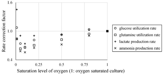 Contrary to cells, metabolites are assumed to be homogenously distributed at all times. This is due to the fact that fast diffusion dominates mass transfer in the small reactor considered for case study. For larger bioreactors, local diffusive mass transfer has lower importance relative to convection, so the flux matrix may be used for calculation of distribution of metabolites [18]. The dissolved oxygen (DO) concentration is also assumed to be homogenously distributed. In the calculation of DO concentration, mass transfer and cellular uptake are considered. The ratio of rates of oxygen uptake to carbon dioxide production by cells has been reported to vary within a narrow range around 1 [56]. So the oxygen uptake rate (OUR) is assumed to be 0.35 pmol·cell−1·h−1, which has been reported for carbon dioxide production [57]. The overall volumetric mass transfer coefficient, kLa, is calculated using Equation (7), in which is superficial gas velocity (m/s) for computational cell under operating condition [33]. Volumetric mass transfer coefficient is the product of liquid phase mass transfer coefficient; kL (m/s) and specific interfacial area; a (m2·m−3). Mass transfer stops after reaching the saturation concentration at 37 °C. The reported saturation mass fraction of oxygen is 3.43 × 10−5 for [58]. The unstructured model is assumed to predict metabolite uptake and production rates when the culture is oxygen-saturated. Experimental data show the dependence of these rates on the concentration of dissolved oxygen [59]. The reported data are used to calculate correction factors for metabolites’ uptake and production rates at different concentrations of DO (Figure 2). Uptake and production rates of metabolites predicted by the unstructured model are multiplied by correction factors to take into account the effects of mass transfer mechanism on metabolism of cells.