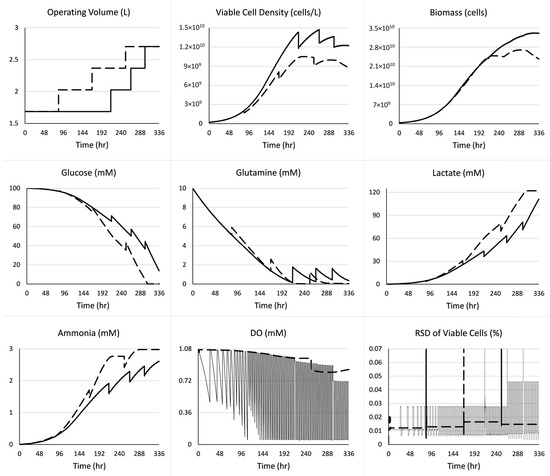 The definition of states of operation creates a finite set of admissible actions for every point in time. Depending on the present operational conditions, it is possible to increase or decrease impeller rotation speed, stop or start air sparging, and feed or not feed. It is also possible to continue under the current conditions. Changing the state of operation is limited to once every 2 h. The concentrations of glucose and glutamine, initially and in feed, are constrained to be under 100 and 10 mM, respectively. The solid lines in Figure 5 show the system operated under the policy obtained from solving the optimization problem described in Equations (8)–(11) (system 1). Although the existence of multiple local optima cannot be ruled out, the solution shows improvement in the yield of operation through manipulation of feeding schedule and composition, agitation, and aeration rates. Nutrient concentrations stay at their upper bounds due to the limited number of feeding steps. The criterion for aeration is 47% of saturated DO concentration, i.e., aeration starts if DO concentration falls below this value and stops otherwise. The obtained criterion for agitation is 0.02%. The impeller rotation speed is increased if the RSD of distribution of cells over compartments is greater than the agitation criterion. In the opposite case, where RSD has a smaller value, the lower agitation rate is selected for the next 2 h. For comparison, the dashed lines in Figure 5 show the system operating with the same initial and feed compositions but a uniform feeding schedule (system 2). System 2 is consistently aerated and agitated at 300 RPM, i.e., the criteria for aeration and agitation are 100% DO saturation and RSD of 0%, respectively. Schedule of feeding should be determined with consideration of capacity of the reactor and duration of operation. Early addition of feed, despite increasing cellular population, causes accumulation of lactate and ammonia in the system, which further inhibits growth. Late feeding, on the other hand, results in poor utilization of nutrients and reactor capacity. Solving the optimization problem results in feeding times of 215, 265, and 300 h after the start of cultivation. Even with a limited number of feeding steps, through the manipulation of the feeding schedule, the cells in system 1 are provided with enough nutrients to maintain growth throughout the operation. Inclusion of mass transfer mechanism in the model leads to an improvement in aeration. The DO concentration drops quickly when aeration stops because of fast consumption by cells. Stopping and starting aeration according to the near-optimal policy prevents loss of viable cells due to unnecessary aeration while guaranteeing that DO is not depleted. The impeller rotation speed switches between 150 and 225 RPM for most of the operation to maintain RSD of distribution of cells at 0.02%. The three sharp peaks in RSD values show disturbances in spatial homogeneity of cells caused by feeding. The declining trend in net growth that happens toward the end of the process is due to the fact that the cellular growth rate, which is reduced by the inhibitory effects of metabolites, cannot compete with the cell loss due to the effects of hydrodynamics. The results demonstrate that integrated modeling is able to capture the behavior of the system using a mechanistic understanding of the reactor without the need for unnecessary assumptions.