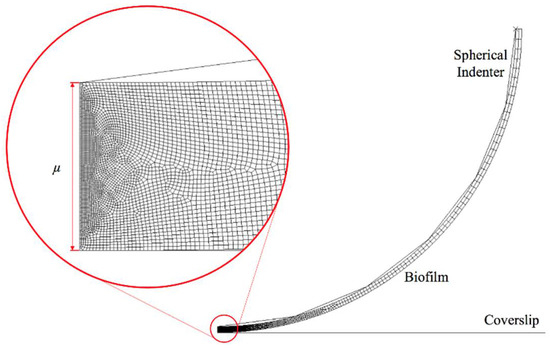 A 2D axisymmetric finite element model was created in ABAQUS 6.10 software. As shown in Figure 1, the biofilms were created as a thin layer attached to a spherical indenter with a tip radius of 25 μm, which represents the experimental setting as described in [2]. In addition, the thickness of biofilms (μ) in this study was assumed to be 0.5 μm and 3 μm, which represent the early stage biofilm (almost monolayer of biofilm) and multilayer biofilm [2]. The interface between the spherical tip and the biofilm was assumed to be perfectly bonded, in such case, there is no separation between the tip and biofilm during and after deformation. The element type is CAX4R (A 4-node bilinear axisymmetric quadrilateral with reduced integration) for the linear viscoelastic material; while CAXA4RH (a 4-node, reduced-integration, hybrid, axisymmetric element with nonlinear asymmetric deformation) was adopted for hyper-viscoelastic material. Both element types are capable for modelling large deformation. In order to capture the deformation of biofilms accurately while enabling computational efficiency, the progressive mesh approach was used, which means that the mesh size becomes smaller as it approaches the indenter. This results in 17,041 and 35,477 elements assigned to 0.5 μm and 3 μm thick biofilms, respectively. The maximum displacement was set as 0.1 μm and 0.6 μm for the thinner and thicker biofilms, in which case the ratio of maximum displacement to thickness was the same. The Young’s modulus of the biofilms was set at 170 kPa [2]. The spherical indenter and the glass coverslip were modelled as a rigid body.