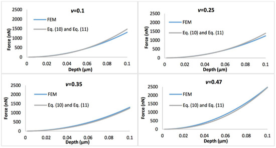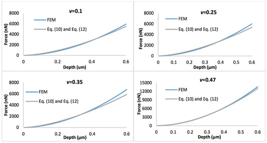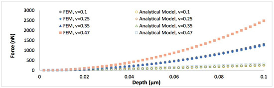 The comparison of the simulated force-displacement curves and the analytical model (Equation (4)), when the thickness of biofilm is 0.5 μm and the Poisson’s ratio varies between 0.1 and 0.47.