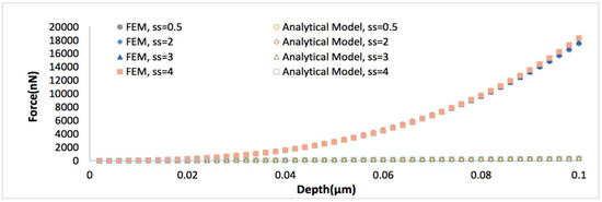 Force versus indentation depth curves comparing the analytical viscoelastic model Equation (4) to the finite element (FE) simulations, when the thickness of biofilm is 0.5 μm, Poisson’s ratio is 0.4999, strain stiffening component ranges from 0.5 to 4.