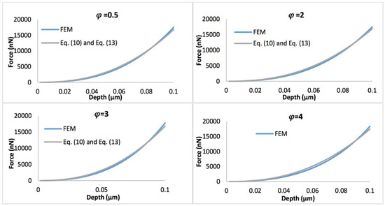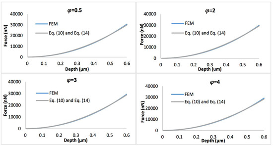 It has been found that the effective radius is no longer constant and actually depends on the penetration depth and Poisson’s ratio, which is responsible for the deviation between the FEM and Equation (4). Hence, the existing model needs to be improved by considering the dynamically changing effective R. To start with, a geometry parameter can be introduced to enable the match between the simulated force and the calculated force,