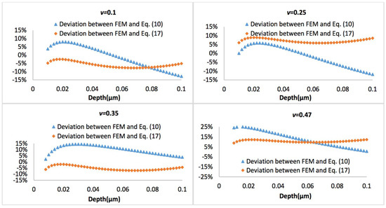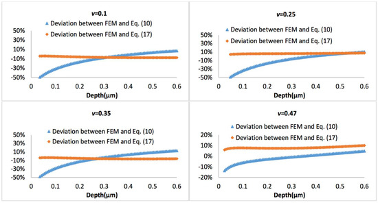 Figure 10 and Figure 11 display the representative deviation between FEM and Equation (10) or Equation (17) at biofilm thickness of 0.5 μm and 3 μm, with the Poisson’s ratio varies between 0.1 and 0.47. It is observed that average errors between Equation (10) and FEM is larger than that between Equation (17) and FEM.