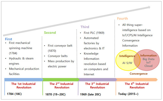 The 4th Industrial Revolution refers to a new form of the industrial revolution through the intellectualization of systems based on big data and AI (Artificial Intelligence). As shown in Figure 1, the 1st Industrial Revolution was a starting point of machine-based production systems such as hydraulic or steam-powered manufacturing systems. The 2nd Industrial Revolution led to a mass-production system using conveyor belts and electric power, while the 3rd Industrial Revolution resulted in factory automation based on electronics and IT. The 4th Industrial Revolution further added advanced ICT technologies to such a factory automation system.