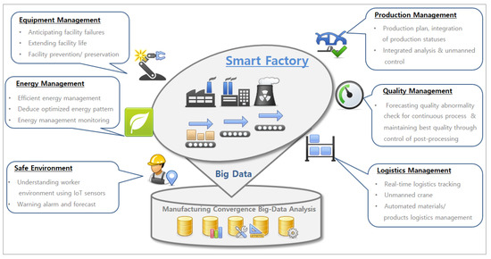 Figure 2 presents the configuration of an ICT-based smart factory where the entire operation/management process involving facilities, energy, safety production, quality, and distribution is carried out by adopting ICT technology. The productivity and quality can be expected to be improved through the production and quality forecast based on analysis of the data collected.