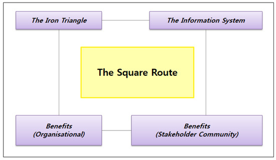 Atkinson represented IT project performance with a square route. As shown in Figure 3, his square route distinguished the conventional project performance measuring elements (i.e., time, quality, and cost) from the quality and performance of the information system, the performance of the stockholders involved in the project, and the performance of the IT system user. In particular, he defined the time, quality, and cost as an Iron Triangle to indicate it as the most important element of the square route.