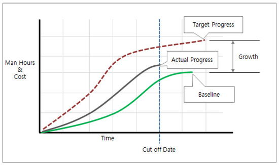 According to ‘Project Success 2597’ [4], the project S-curve allows one to check the flow of project cost input by aggregating the work package costs or the activity costs once a detailed schedule of the project has been confirmed. Also, it is often used to assess the validity of the plan or check if there are any impractical cost inputs. S-curves can be categorized as follows (SJ Lee, 2015 [1]): the first type, Baseline S-curve, is created following the baseline schedule established first; the second type, Target S-curve, is created following the target schedule finally modified, considering the actual progression.; the final type, Actual S-curve, is created based on the actual workload completed. As such, the S-curves play an important role as a project measuring or managing tool for project managers to conveniently recognize various information. The Actual S-curve is commonly located below the Target S-curve, but the two curves meet at the end of the project while converging during the last period of project completion. Figure 5 shows the calculation of project progression using an S-curve.