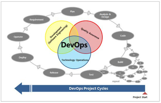 As described in Figure 7, DevOps constructs the system gradually through the repetitive Agile development process and at the same time, the operating personnel participates in the project to swiftly improve the system. Thus, the main idea of DevOps is associated with the Agile software development and Continuous Integration. It does not perform development by forecasting the future based on development models using plans and documents, but it is actually an adaptive development method which continuously creates prototypes on a regular cycle based on practical development and analyzes the requirements for rapid modification. As a result, a single large piece of software is developed. Meanwhile, ‘Continuous Integration’ refers to the task of continuously controlling the quality of the software by continuously performing integration from an early stage. This solves the problem of requiring more time for clearing problems caused by various changes and dependency during the integration process because of variance in coding (i.e., difference between baseline code and final code after completion) [14,15,16,17,18,19,20].