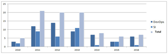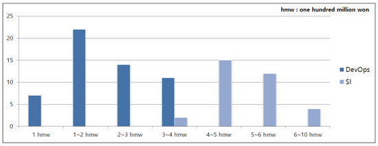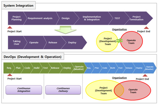 The most significant difference between an SI project and a DevOps project is in the relationship between the main agents of project development and the operation. In the SI projects, they separately organize their own team, and the developed project is transferred to the operating team once the project development has been completed. Also, the operating team does not participate directly in the project during the development stage. On the other hand, in DevOps, they are partially involved in the project team to perform the project development directly or indirectly such that the operation can start without any transfer process. The operation and distribution are carried out during project development and they adapt to the system quickly. Figure 9 shows the comparison between SI and DevOps projects [21,22,23,24].