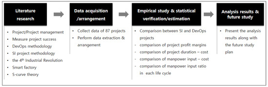 Above, the 4th Industrial Revolution and both manufacturing IT and SI projects were discussed along with the DevOps software development method. In this study, the following research model has been set up by focusing on performing a comparative analysis of an SI project and a DevOps project based on the existing literature. Figure 10 shows the research model.