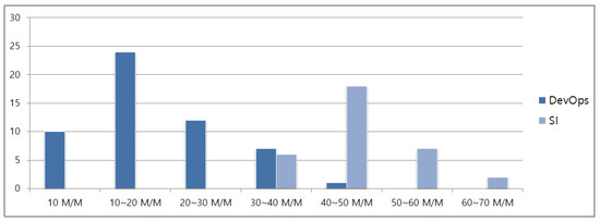 By performing the matching sample t-test for the verification results of the difference in workforce M/M as shown in Table 14, the significance level for both was 0.021, satisfying p-Value < 0.05. Thus, the null hypothesis was rejected in favor of the alternative hypothesis which had assumed that there was a significant difference. The average monthly workforce input of DevOps projects was 7,900,760 won compared to 8,308,568 won for SI projects. The verification found the significance in such a difference.