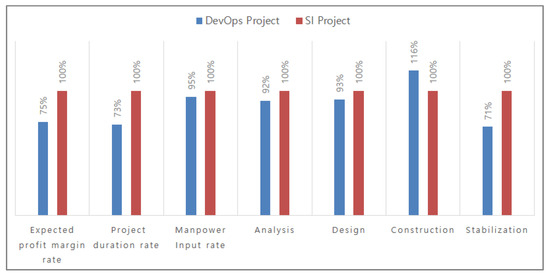 As shown in Figure 16, the execution profit margin of DevOps projects was higher by about 57% on average at the time of project completion compared to SI projects while the actual execution cost during the project period was lower by an average of 17%. The difference in the workforce input cost was not high (5%) but it was higher as well. Also, during the construction phase, the DevOps projects used about 17% more workforce than the SI projects but in the stabilization phase, the input was relatively low (29%). Although there were some differences in the analysis and design phases, the t-test has confirmed that the differences in the analysis phase (8%) and the design phase (7%) are not significant enough. In conclusion, DevOps projects use lower costs and offer more efficiency than SI projects. Also, the former inputs the workforce at a higher rate for construction but the latter uses more workforce in the stabilization phase and such results have been proven to be statistically significant. It is possible to assume that the reason for such differences between two types of projects is that there are many small-scale projects such as improvement projects during the operation stage for DevOps projects but for the SI projects, most of them are newly contracted projects or long-term projects. Further, for the DevOps projects, the existing operating personnel usually participate in the project such that the accuracy of analysis and design can be high enough to construct the system reliably with lesser workforce than the SI projects may require.