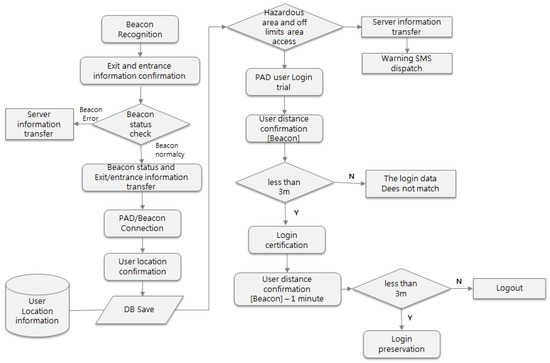 Moreover, the factory manager will be able to perform rescue and accident control immediately when there is an emergency. Workers’ positions and their numbers will be determined for further measures. Figure 18 describes the algorithm developed for the security validation and warning system. The workers’ beacon signals will be checked when they access the factory facilities. The voltage level, beacon ID, RFID, and signal strength of each beacon are checked for analysis by the server so that if the worker has been allowed to access any of the factory facilities in normal working hours, he will be accepted; otherwise, he will need to get special approval. As the current positions of the workers are continuously transmitted to the server through a portable device and the beacons are connected to various smart devices/equipment, the beacon manager can estimate the distances and other necessary data. The position data is then accumulated at the server to generate statistics useful in determining the most efficient worker traffic. If the workers attempt to approach or enter a certain restricted/unauthorized area, a warning SMS will be sent to the worker and the safety manager with alarms.