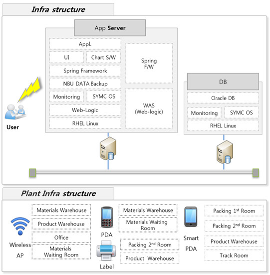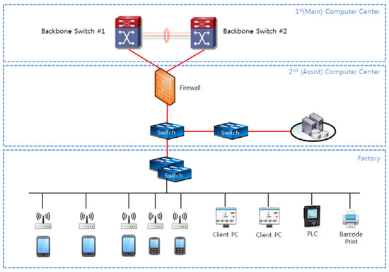 A Smart Factory security management system using a series of Bluetooth beacons has been designed for this study using Java spring. The system is divided into two parts (i.e., a Web UI (User Interface) for MES/WMS and an Android UI for smart PAD). The production information is stored in the Oracle RDBMS (Relational Data Base Management System) along with each worker’s location data. The factory adopts an independent internal network (Factory Area/FA network) that does not have any links with external systems or networks. Also, the wireless equipment/devices (e.g., Smart PAD, Client PC, PLC devices, PDA, and barcode printer) must have a security setting so that all of them must register their MAC (Media Access Control) addresses to access the FA network. The data processing room is connected to the factory network first via firewall and then to the office network (OA network) to physically avoid external influences that could be dangerous to the factory control facilities and information network. This type of structure could also increase the network speed as well. Figure 22 below shows the network configuration.