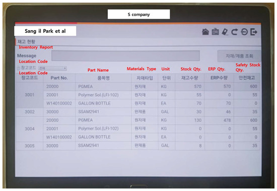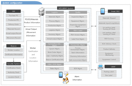 The distance between the worker and the beacon is calculated when a worker tries to log on to a smart device, and if the calculated distance remains within the range of 3 m, he/she will be accepted. However, if there is no signal communication between them, the smart device will repeat the distance calculation at an interval of 1 min. Also, if the calculation result exceeds the 5 m range, the smart device will cease its operation or stay logged in otherwise. As an example, Figure 19 shows an overall production system configuration for the chemicals used to produce semiconductors. The final products are double-packed and delivered to the customers. The primary production process includes solution-mixing and concentration control with 3 or 5 filters while the final process deals with packing, labeling, and wrapping with a sun-blocking film. These products in boxes are then loaded onto pallets and stored in the warehouse waiting for delivery. The packing style will change according to each customer’s requirement. The production line is cleaned once the production task has been completed. Although volumes of required raw materials are rather small in quantity, they should be applied in exact quantities and kept under strict control, separating them into minimum packing units. The quality inspection process is conducted in three steps: inspection of materials, intermediate products, and final products. In the first step, the qualities and the specifications of raw materials are checked while the accuracy of mixing and concentrations are verified in the second step. Finally, the products are re-checked after filtering has been completed. Figure 20. shows the process of network configuration.