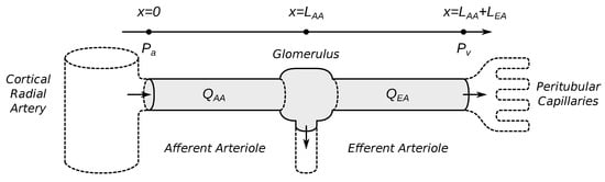 To obtain an accurate representation of blood flow, i.e., volume flow and pressure profile, we model a segment of the renal vasculature consisting of an afferent and the associated efferent arterioles as shown in Figure 1. Consistent with the renal microanatomy, we represent the two vessels as consecutive straight tubes that extend from the cortical radial artery () to the glomerulus (), and from the glomerulus to the entrance of the peritubular capillary network (), respectively.