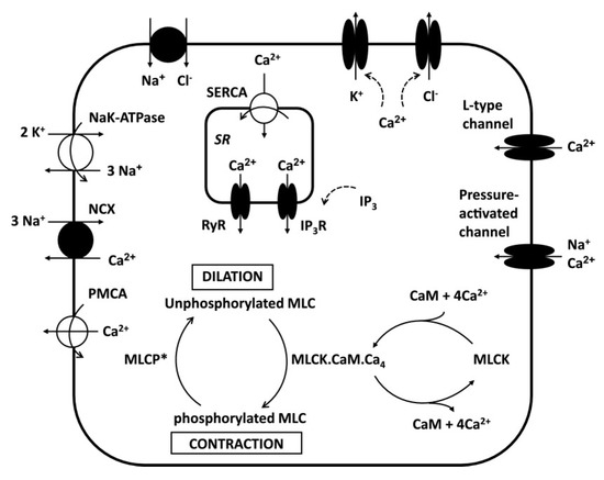 For each smooth muscle cell we adopt the model of [29] which represents in detail subcellular processes such as transmembrane ionic transport, Ca dynamics, and kinetics of myosin light chain phosphorylation. For convenience, we include a schematic of the myogenic mechanism in Figure 3, and refer the reader to [29,30] for complete details on model equations. Among other variables, the smooth muscle cell model predicts muscle membrane potential , cytosolic concentrations for K, Na, Cl, Ca, and the fraction of phosphorylated myosin light chains.
