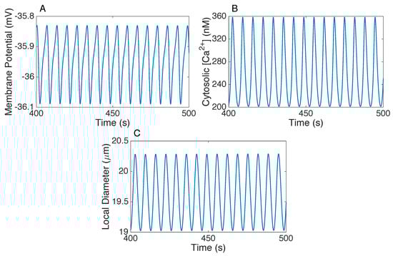 Predicted oscillations for the first cell in the afferent arteriole at an inflow pressure of 100 mmHg for the (A) membrane potential; (B) cytosolic concentration of Ca; and (C) afferent arteriole local diameter.
