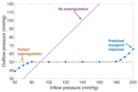 To investigate the myogenic response of the model’s afferent arteriole, we computed the outflow pressure and time- and space-averaged diameter of the afferent arteriole given different constant inflow pressures . For a comparison, the dotted line in Figure 5 indicates the values expected in the absence of autoregulation (i.e., inflow perturbations are transmitted unattenuated to outflow perturbations) and the dashed line indicates the values expected in the presence of perfect autoregulation (i.e., inflow perturbations are not transmitted to outflow perturbations). We emphasize that, as these lines are shown only for visual purposes, their computation is not based on the present model and instead they can be directly derived from basic principles [56]. As seen in Figure 5, our results indicate that as increases, the predicted outflow pressure of the afferent arteriole increases only when is below ≈80 mmHg or above ≈180 mmHg. The predicted pressure response lies below the line representing perfect autoregulation for low , coincides with the line for a wide range of inflow pressures (≈80–180 mmHg), and then lies above the line for large . A similar autoregulatory plateau is predicted for (not shown). We note that this plateau is in almost complete agreement with Figure 8 in [11], where renal blood flow is measured in vivo over a range of arterial blood pressures in whole kidney preparations. Our model is able to achieve almost perfect autoregulation for a physiologically relevant range of inflow pressures that is larger than the corresponding range predicted by the cellular models of [30,55].