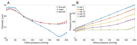 Figure 6A shows the steady-state diameters (time- and space-averaged across afferent arteriole cells) for different constant inflow pressures. As in [30,55], the model predicts vasodilation for small inflow pressures and vasoconstriction for large inflow pressures. Our model predicts a larger mean diameter for small inflow pressures (≤80 mmHg) than [30,55] and approximately the same mean diameter for large inflow pressures (≥160 mmHg).