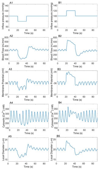 Rows 2–5 of Figure 7 show the evolution of flow , membrane potential, cytosolic Ca concentration, and local vascular diameter for the first cell in the modeled afferent arteriole under a pressure pulse decrease to 80 mmHg (left) and a pressure pulse increase to 120 mmHg (right). The pressure decrease leads to a reduction in membrane potential, which triggers a rapid decrease in the amplitude of the Ca concentration oscillations and subsequently a slower drop in the local vascular diameter [29,30]. This reduction in the local vascular diameter corresponds to passive constriction of the model afferent arteriole due to the sudden pressure drop, which is followed by a slower dilation due to the activation of the myogenic response (Figure 7A5) [29]. The short pressure pulse does not allow the local vascular diameter to fully dilate to a diameter larger than the baseline 20.1 m during the pressure decrease. However, the local vascular diameter returns to a larger mean amplitude of oscillations after the return to baseline pressure at 40 s that stabilizes slowly (≫40 s) to the pre-step value. Qualitatively, our model predicts correctly this active response [3,4]. Furthermore, although somewhat slower than reported in the renal experimental literature [3,4], our predicted time course is also quantitatively similar to the predictions of existing vascular models, for example [23,75,76].